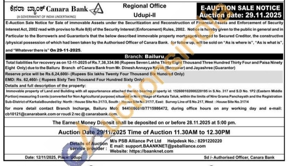 Immovable property of Land and Building with all appurtenance attached thereto bearing property id: 152600102000220195 in S.No. 317 and S.D No. 1P2 (Eastern Middle Portion) measuring 5 cents (converted for Non Agricultural purpose) situated in Nire Village of Karkala Taluk, within the limits of Nire Grama Panchayath and the Registration Sub-District of Karkala Bounded by: North: House Site No.317/3, South: House Site No.317/7, East: Survey Line of S No.217, West: House Site No.317/4