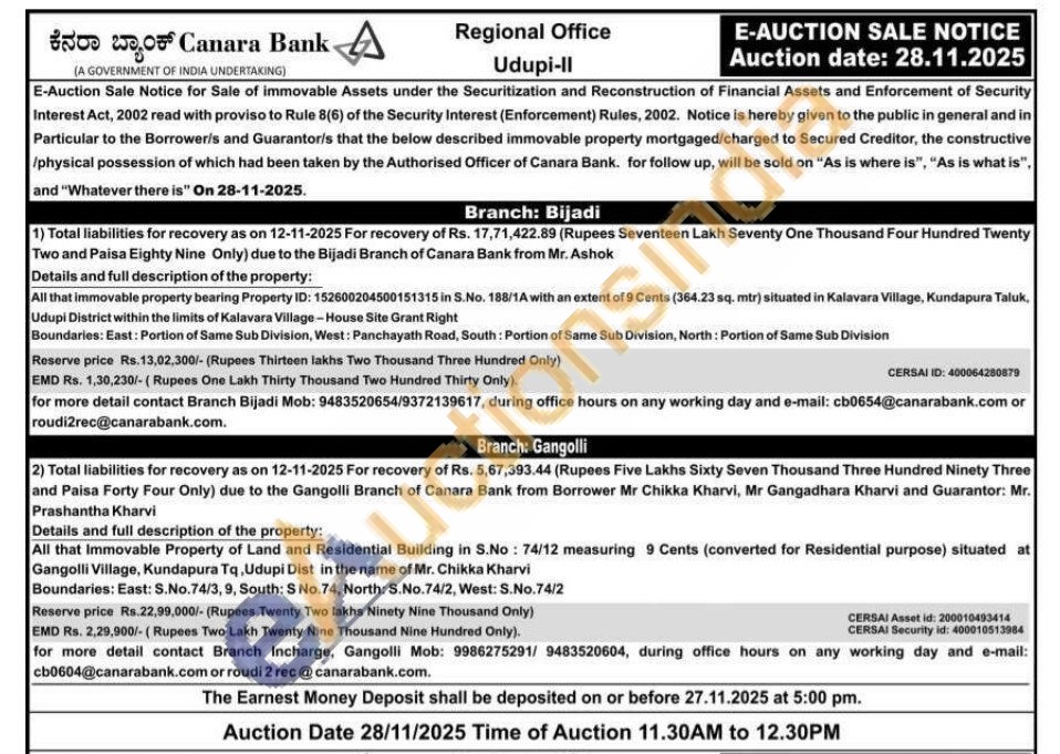 1) All that immovable property bearing Property ID: 152600204500151315 in S.No. 188/1A with an extent of 9 Cents (364.23 sq. mtr) situated in Kalavara Village, Kundapura Taluk, Udupi District within the limits of Kalavara Village-House Site Grant Right Boundaries: East: Portion of Same Sub Division, West: Panchayath Road, South: Portion of Same Sub Division, North: Portion of Same Sub Division
