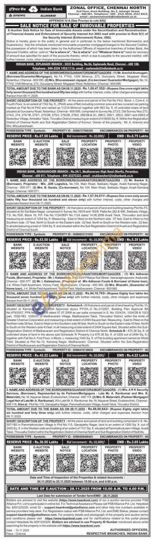 4) All the piece and parcel of land and building comprised in S. No 597/183 in Pamvnathukulam Village in Plot No. 115. Ganapathy Nagar, land to an extent of 1200 Sq. ft. out of 2400 Sq. ft. in the Western side and building of an extent of 1121 Sq. ft. situated at Pammathukulam Village, Avadi Taluk, Thiruvallur District within the Registration District of Chennai North and Sub Registration District of Redhills