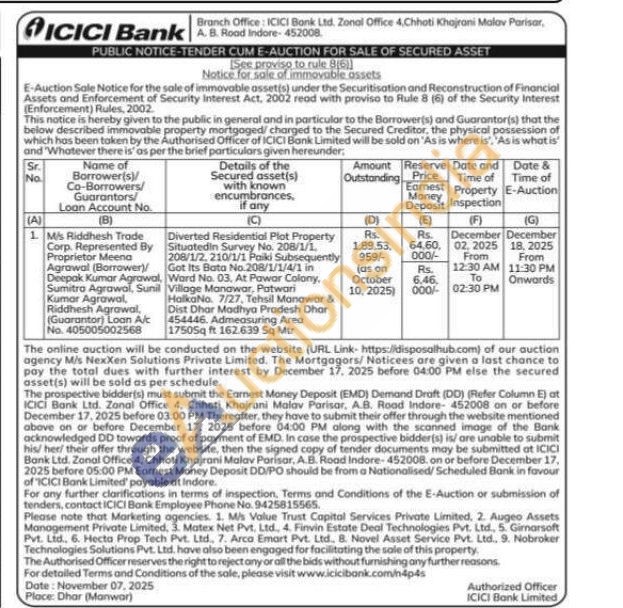 Diverted Residential Plot Property Situatedin Survey No. 208/1/1. 208/1/2, 210/1/1 Paiki Subsequently Got Its Bata No.208/1/1/4/1 in Ward No. 03. At Pawar Colony, Village Manawar, Patwari HolkaNo. 7/27, Tehsil Manawar & Dist Dhar Madhya Pradesh Dhar 454446. Admeasuring Area 17505q ft 162.639 Sq Mtr