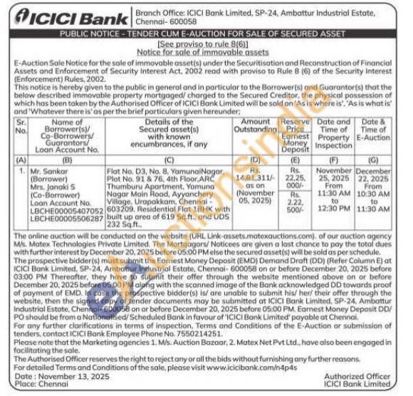 Flat No. D3, No. 8, Yamunal Nagar, Plot No. 91 & 76, 4th Floor, ARC Thumburu Apartment, Yomuna Nagar Main Road, Ayyanchery Village, Urapakkam, Chennai-603209. Residential Flat 18HK with built up area of 619 Sq.ft., and UDS 232 Sq.ft
