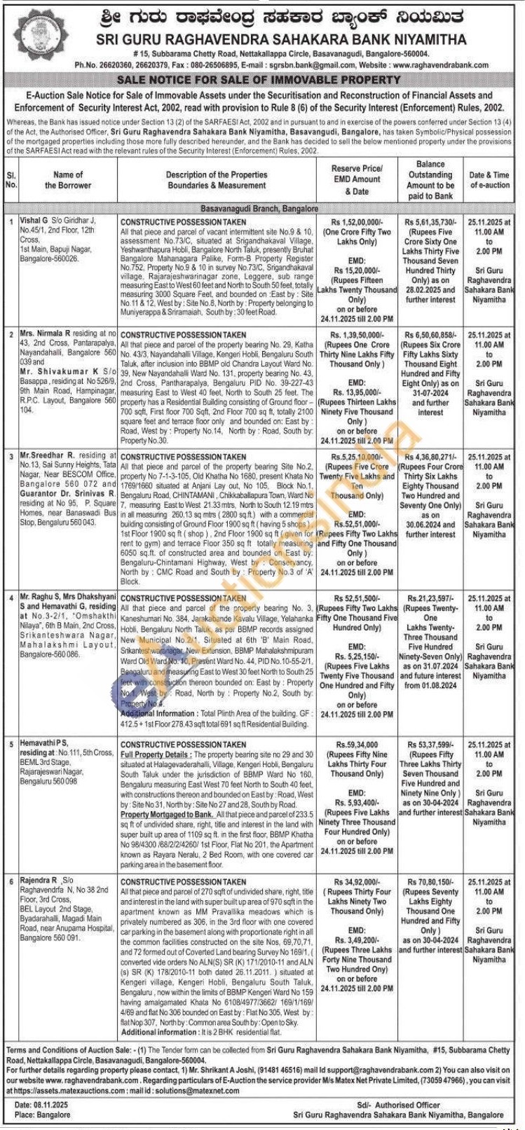 6) All that piece and parcel of 270 sqft of undivided share, right, title and interest in the land with super built up area of 970 sqft in the apartment known as MM Pravallika meadows which is privately numbered as 306, in the 3rd floor with one covered car parking in the basement along with proportionate right in all the common facilities constructed on the site Nos, 69.70,71, and 72 formed out of Coverted Land bearing Survey No 169/1.( converted vide orders No ALN(S) SR (K) 171/2010-11 and ALN (s) SR (K) 178/2010-11 both dated 26.11.2011) situated at Kengeri village, Kengeri Hobli, Bengaluru South Taluk, Bengaluru, now within the limits of BBMP Kengeri Ward No 159 having amalgamated Khata No 51084977/3662/ 169/1/169/4/69 and flat No 306 bounded on East by: Flat No 305, West by: flat Nop 307, North by: Common area South by: Open to Sky. Additional information: It is 2 BHK residential flat