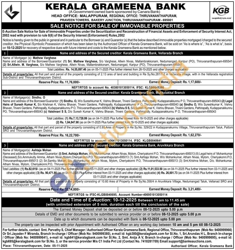 Details of property/ies: All that part and parcel of the property consisting of 0.95 Ares of Property in Re Sy.No. 329/22 in Kudappanakunnu Village, Thiruvananthapuram Taluk, Pattom SRO and Thiruvananthapuram District.