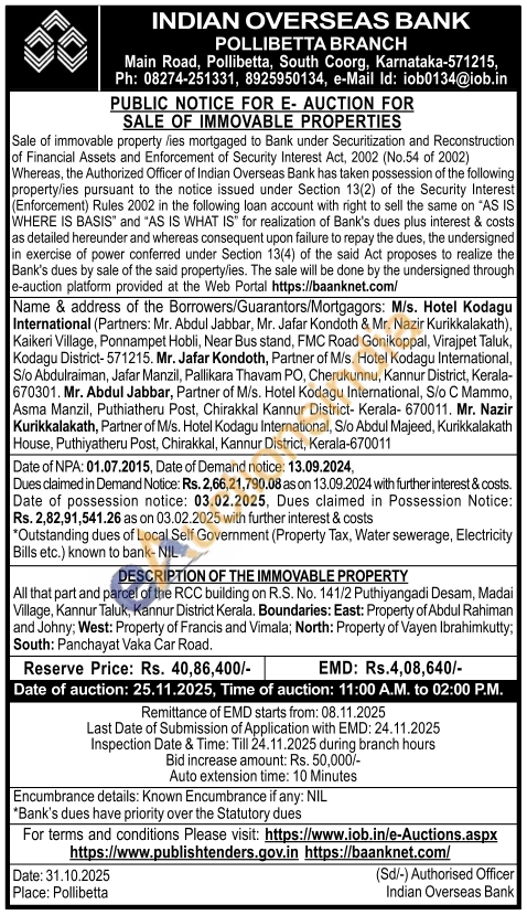 All that part and parcel of the RCC building on R.S. No. 141/2 Puthiyangadi Desam, Madai Village, Kannur Taluk, Kannur District Kerala. Boundaries: East: Property of Abdul Rahiman and Johny; West: Property of Francis and Vimala; North: Property of Vayen Ibrahimkutty; South: Panchayat Vaka Car Road.