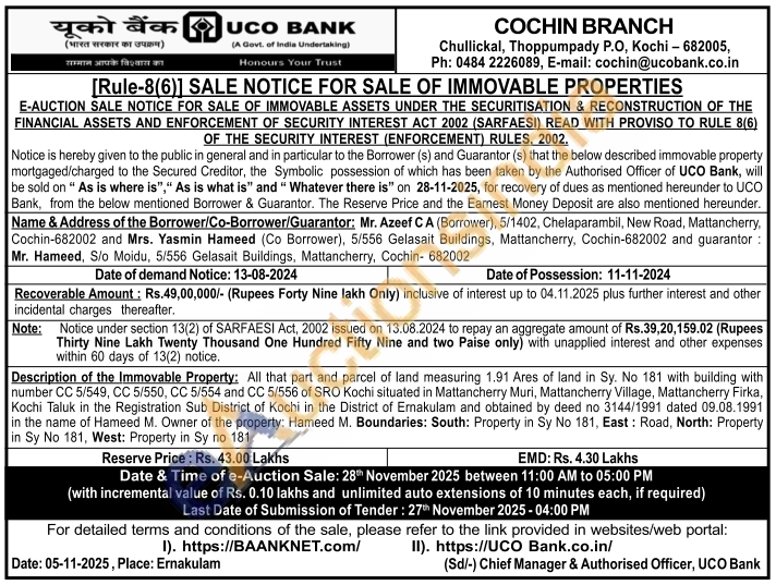 Description of the Immovable Property: All that part and parcel of land measuring 1.91 Ares of land in Sy. No 181 with building with number CC 5/549, CC 5/550, CC 5/554 and CC 5/556 of SRO Kochi situated in Mattancherry Muri, Mattancherry Village, Mattancherry Firka, Kochi Taluk in the Registration Sub District of Kochi in the District of Ernakulam and obtained by deed no 3144/1991 dated 09.08.1991 in the name of Hameed M. Owner of the property: Hameed M. Boundaries: South: Property in Sy No 181, East: Road, North: Property in Sy No 181, West: Property in Sy no 181