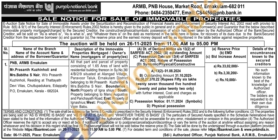 All that part and parcel of property consisting of 1.65 Ares of land with residential building thereon in Sy.No.36/4/B/2/9 situated at Alangad Village, Paravoor Taluk, Ernakulam District belonging to Mr.Prasanth Kuzhinholi & Mrs. Babitha S Nair. Boundaries: North: Property of Igna shius South: Property belonging to Manu Augustine and Panchayath Road; East: Property of Ignashius: West: Property belongs to Vipin Babu.