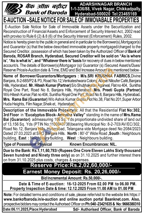 Description of the Immovable Property/s: All that the Residential Flat No:302, 3rd Floor in "Eucalyptus Block-Amrutha Valley" standing in the name of Mrs. Rama Bai (Guarantor) admeasuring 106 Sq. Yds proportionate undivided share of land out of 13,156 Sq. Yds (PTIN No: 1100843738) bearing Municipal No: 8-2-703/AV/EC/302, Road No. 12, Banjara Hills, Hyderabad, Telangana vide Mortgage deed No:2084/2023 Dated 27.03.2023 at SRO Banjara Hills. North: 80'-0" Wide Road, South: Neighbours building, East: Neighbours building, West: Neighbours building.
