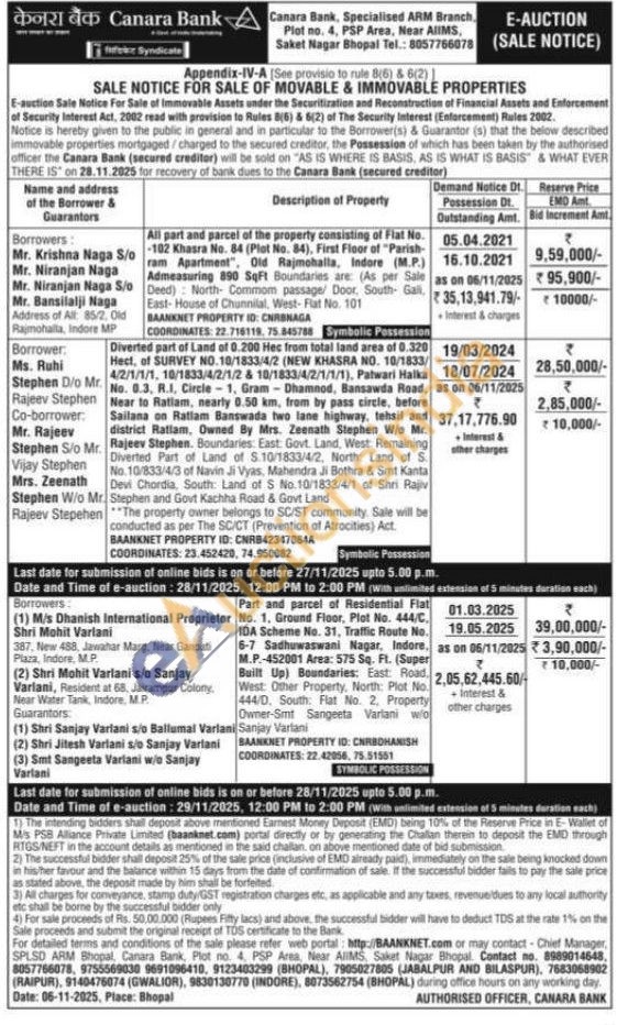 Part and parcel of Residential Flat No. 1. Ground Floor, Plot No. 444/C. IDA Scheme No. 31, Traffic Route No. 6-7 Sadhuwaswani Nagar, Indore, M.P.-452001 Area: 575 Sq. Ft. (Super Built Up) Boundaries: East: Road. West: Other Property, North: Plot No. 444/D. South: Flat No. 2,