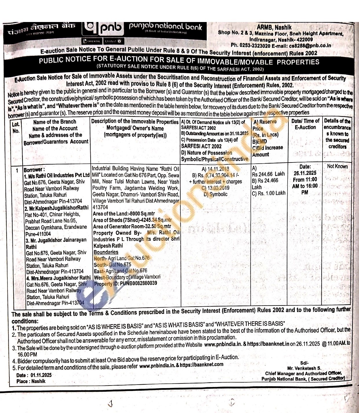 Industrial Building Having Name "Rathi Oil Mill" Located on Gat No 676 Part, Opp. Sewa Mill, Near Tulsi Mohan Lawns, Near Yash Poultry Farm, Jagdamba Welding Work, Geeta Nagar, Dhamori- Vambori Shiv Road, Village Vambori Tal Rahuri Dist Ahmednagar 413704 Area of the Land:-8000 Sq.mtr Area of Sheds (7Shed)-4245.34 Sq.mtr Area of Generator Room-32.50 Sq.mtr Property Owned By M/s. Rathi Oil Industries PL Through its director Shri Kalpesh Rathi Boundaries North-Agri Land Gat No.676 South-Gat No.675 East-Agri Land Gat No.676 West-Boundary of Village Vambori Property ID: PUNB0082880039