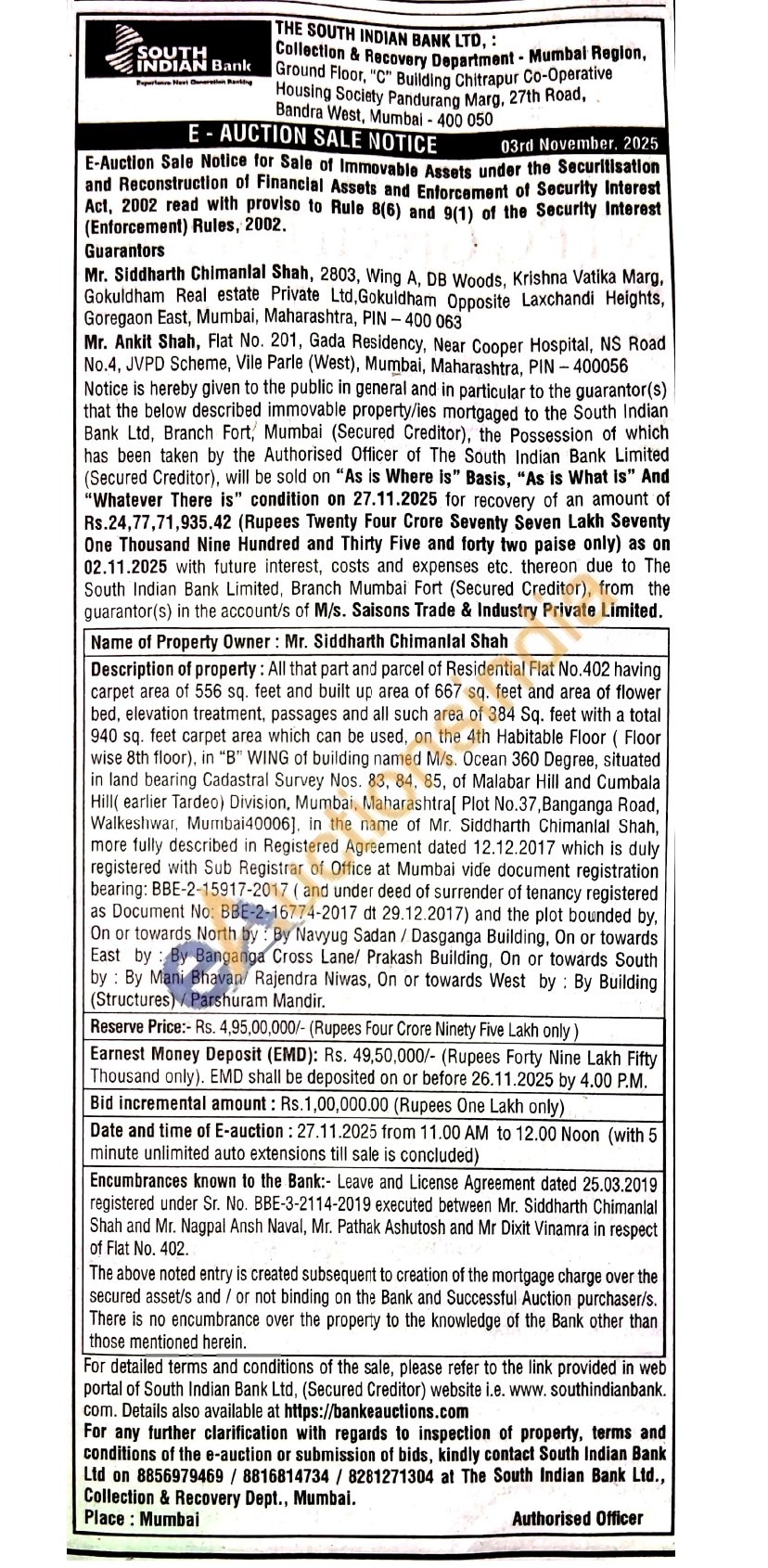 Description of property: All that part and parcel of Residential Flat No.402 having carpet area of 556 sq. feet and built up area of 667 sq. feet and area of flower bed, elevation treatment, passages and all such area of 384 Sq. feet with a total 940 sq. feet carpet area which can be used, on the 4th Habitable Floor (Floor wise 8th floor), in "B" WING of building named M/s. Ocean 360 Degree, situated in land bearing Cadastral Survey Nos. 83, 84, 85, of Malabar Hill and Cumbala Hill(earlier Tardeo) Division, Mumbai, Maharashtra Plot No.37, Banganga Road, Walkeshwar, Mumbai40006], in the name of Mr. Siddharth Chimanlal Shah, more fully described in Registered Agreement dated 12.12.2017 which is duly registered with Sub Registrar of Office at Mumbai vide document registration bearing: BBE-2-15917-2017 (and under deed of surrender of tenancy registered as Document No: BBE-2-16774-2017 dt 29.12.2017) and the plot bounded by. On or towards North by: By Navyug Sadan/Dasganga Building, On or towards East by By Banganga Cross Lane/ Prakash Building, On or towards South by By Mani Bhavan/ Rajendra Niwas, On or towards West by: By Building (Structures)/Parshuram Mandir.