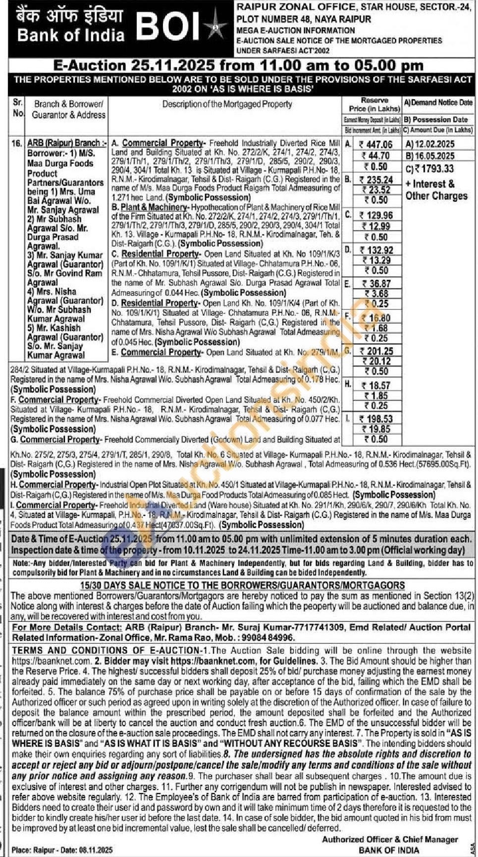 H. Commercial Property-Industrial Open Plot Situated at Kh. No. 450/1 Situated at Village-Kurmapali P.H.No.-18, R.N.M.-Kirodimalnagar, Tehsil & Dist-Raigarh (C,G.) Registered in the name of M/s. Maa Durga Food Products Total Admeasuring of 0.085 Hect. (Symbolic Possession)