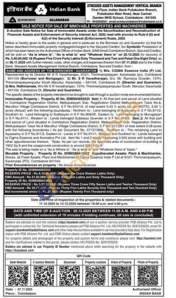 Item 1: All that part and parcel of Land situated in Coimbatore Registration District, Mettupalayam Sub-Registration District Mettupalayam Taluk No.8. Maruthur Village Coimbatore District, SF No.910/1A, of total extent 3.43% acres (as per MOTD), 3.42 acres (Actual) with the following boundaries: Northern to: Land belonging to Ayyasamy in SF No.911/2, Southern to Land belonging to Subbalyan in SF No.909/2E, Eastern to: Land belonging to Murugaiyan in SF No.911/1, Western to: Lands belonged Subbaiya Gownder in SF No. 910/2. Item 2: All that part and parcel of Land situated in Coimbatore Registration District, Mettupalayam Sub- Registration District, Mettupalayam Taluk No.8 Maruthur Village Coimbatore District, SF No. 911/281 of total extent 0.08 acres with the following boundaries (As per Document No. 5713/1999). Northern to The remaining Land to Ayyasamy in SF No.911/2, Eastern to: Lands in SF No.911/1, Western and Southem to: Lands belonged to Cigma Essence and Aromatics Pvt Ltd. Item No 1 and 2 totally measuring 3.505 acres with building and other appurtenances thereon. "Note: As per our records, the approved area of construction of building is 1952 Sq ft and the unapproved construction is around 32618 Sq ft.