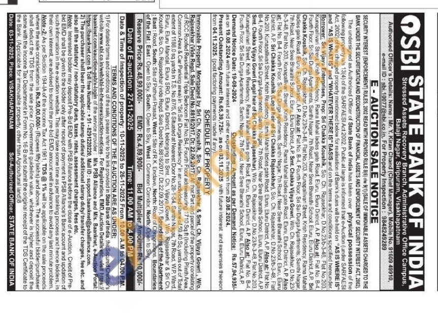 Immovable Property Mortgaged by Sri Ch. Koushik, S/o. Ch. Rajasekhar & Smt. Ch. Vijaya Gowri, W/o. Rajasekhar (Vide Regd. Sale Deed No.8818/2017, Dt: 22.09.2017); All that Part and parcel of the property consisting of RCC Roofed Residential Triple Bedroom Fiat No. B4, Fourth Floor admeasuring 1710 Sq.ft (Including Plinth Area, Common Area & Car Parking area) in "Sri Sai Durga Residency in an undivided share of 59.40 Sq. yards out of Total extent of 1188.0 sq.yards in T.S. No.87/5, 6 Situated at Nearest Door No.28-1-54, Santhi Nagar, 7th Road, W.P. Ward. Eluru, Eluru Mandal, Eluru SRO, Eluru District, belonging to Smt. Ch. Vijaya Gowri. Wio. Rajasekhar & Sri Ch. Koushik, Sio. Ch. Rajasekhar (vide Regd. Sale Deed No.8818/2017, Dt. 22.09.2017). Boundaries of the Apartment East: Road, South: Site of Pathuri Prasad, West: Site of R. K. Enclave, North: Road of Corporations. Boundaries of the Flat: East: Open to Sky, South: Open to Sky, West: Common Corridor, North: Open to Sky