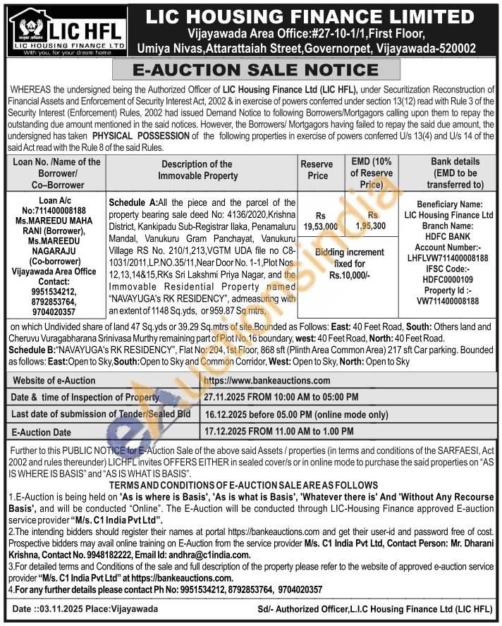 Schedule A:All the piece and the parcel of the property bearing sale deed No: 4136/2020, Krishna District, Kankipadu Sub-Registrar Ilaka, Penamaluru Mandal, Vanukuru Gram Panchayat, Vanukuru Village RS No. 210/1,213, VGTM UDA file no C8-1031/2011,LP.NO.35/11, Near Door No. 1-1, Plot Nos. 12,13,14&15,RKs Sri Lakshmi Priya Nagar, and the Immovable Residential Property named "NAVAYUGA'S RK RESIDENCY", admeasuring with an extent of 1148 Sq.yds, or 959.87 Sq.mtrs on which Undivided share of land 47 Sq.yds or 39.29 Sq.mtrs of site. Bounded as Follows: East: 40 Feet Road, South: Others land and Cheruvu Vuragabharana Srinivasa Murthy remaining part of Plot No. 16 boundary, west: 40 Feet Road, North: 40 Feet Road. Schedule B: "NAVAYUGA's RK RESIDENCY", Flat No: 204, 1st Floor, 868 sft (Plinth Area Common Area) 217 sft Car parking. Bounded as follows: East:Open to Sky, South: Open to Sky and Common Corridor, West: Open to Sky, North: Open to Sky