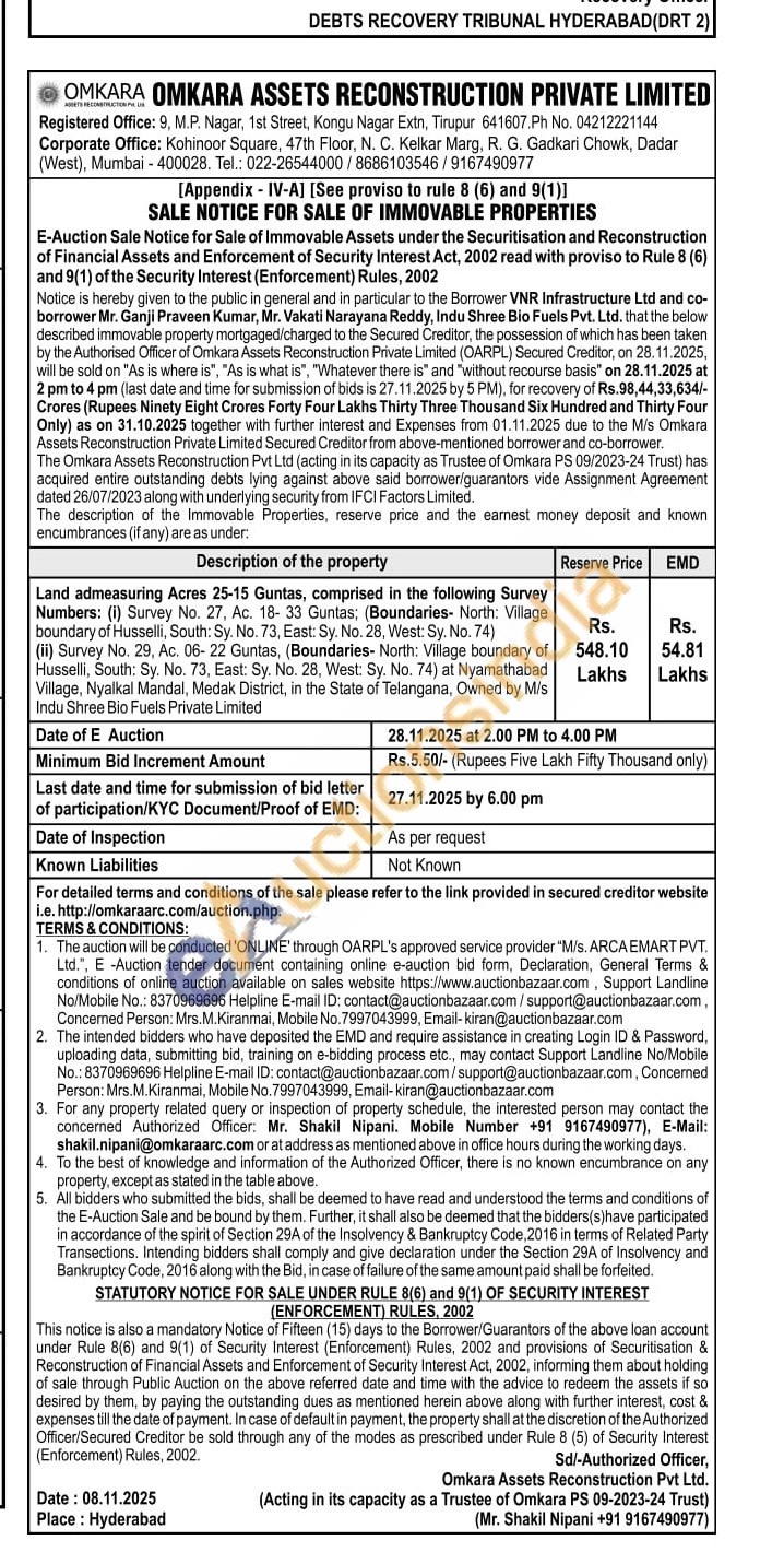 Land admeasuring Acres 25-15 Guntas, comprised in the following Survey Numbers: (i) Survey No. 27, Ac. 18- 33 Guntas; (Boundaries- North: Village boundary of Husselli, South: Sy. No. 73, East: Sy. No. 28, West: Sy. No. 74) (ii) Survey No. 29, Ac. 06-22 Guntas, (Boundaries- North: Village boundary of Husselli, South: Sy. No. 73, East: Sy, No. 28, West: Sy. No. 74) at Nyamathabad Village, Nyalkal Mandal, Medak District, in the State of Telangana, Owned by M/s Indu Shree Bio Fuels Private Limited