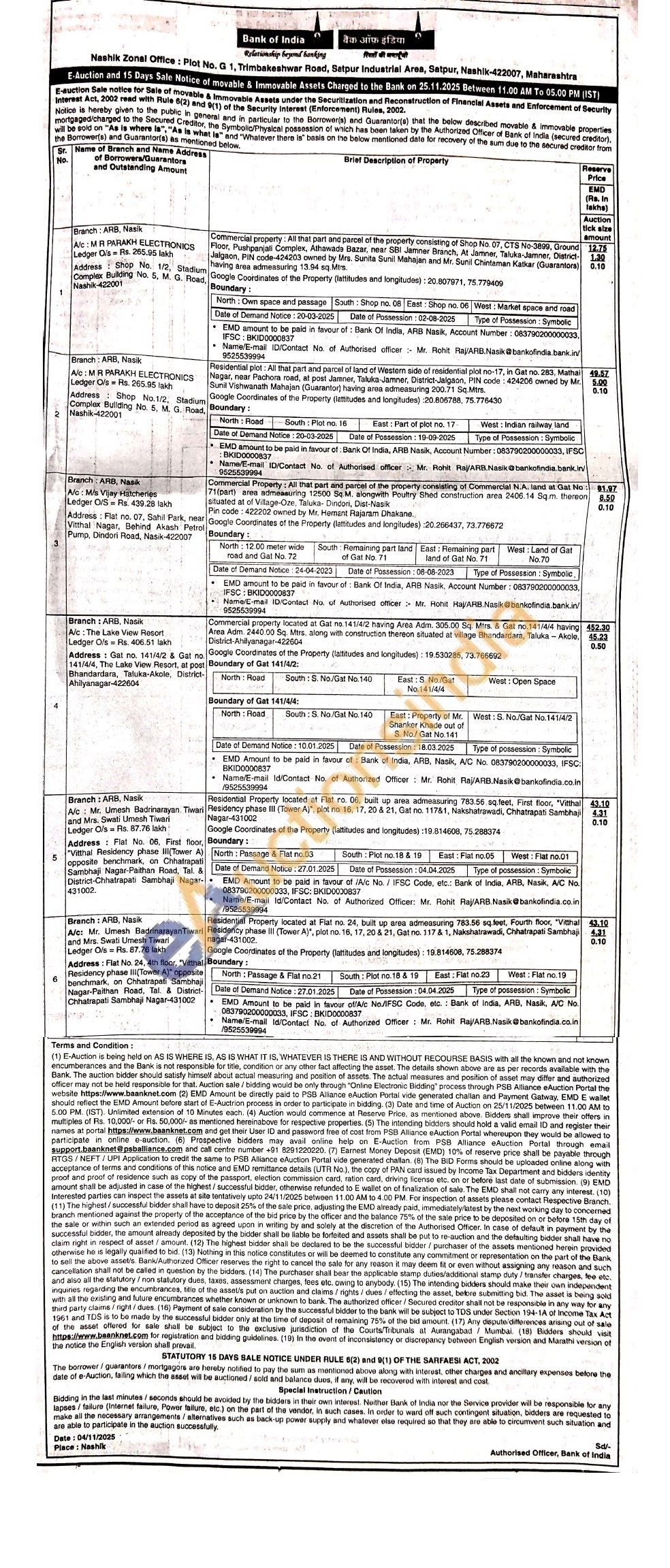 Commercial property: All that part and parcel of the property consisting of Shop No. 07, CTS No-3899, Ground Floor, Pushpanjali Complex, Athawade Bazar, near SBI Jamner Branch, At Jamner, Taluka-Jamner, District-Jalgaon, PIN code-424203 owned by Mrs. Sunita Sunil Mahajan and Mr. Sunil Chintaman Katkar (Guarantors) having area admeasuring 13.94 sq. Mtrs. Google Coordinates of the Property (lattitudes and longitudes): 20.807971, 75.779409 Boundary: North: Own space and passage South: Shop no. 08 East: Shop no. 06 West: Market space and road