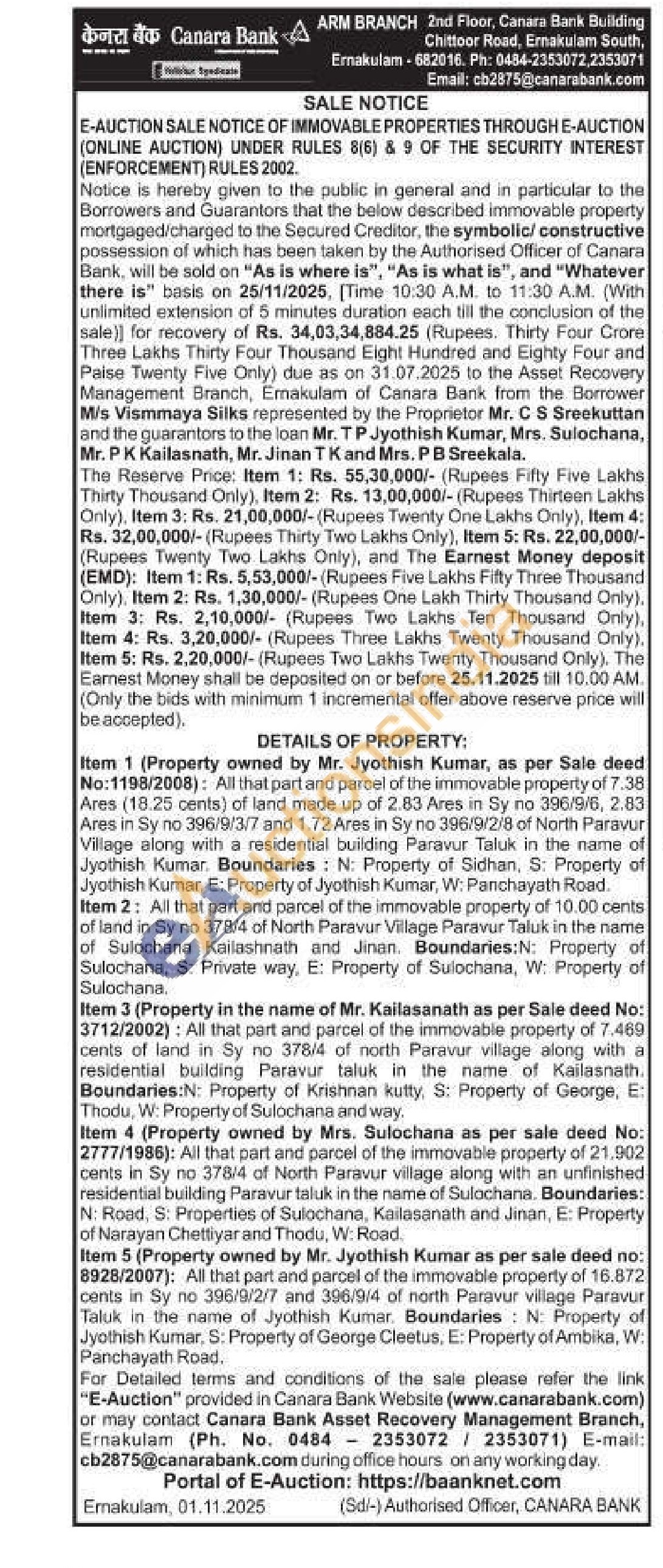 Item 5 (Property owned by Mr. Jyothish Kumar as per sale deed no: 8928/2007): All that part and parcel of the immovable property of 16.872 cents in Sy no 396/9/2/7 and 396/9/4 of north Paravur village Paravur Taluk in the name of Jyothish Kumar. Boundaries: N: Property of Jyothish Kumar, S: Property of George Cleetus, E: Property of Ambika, W: Panchayath Road