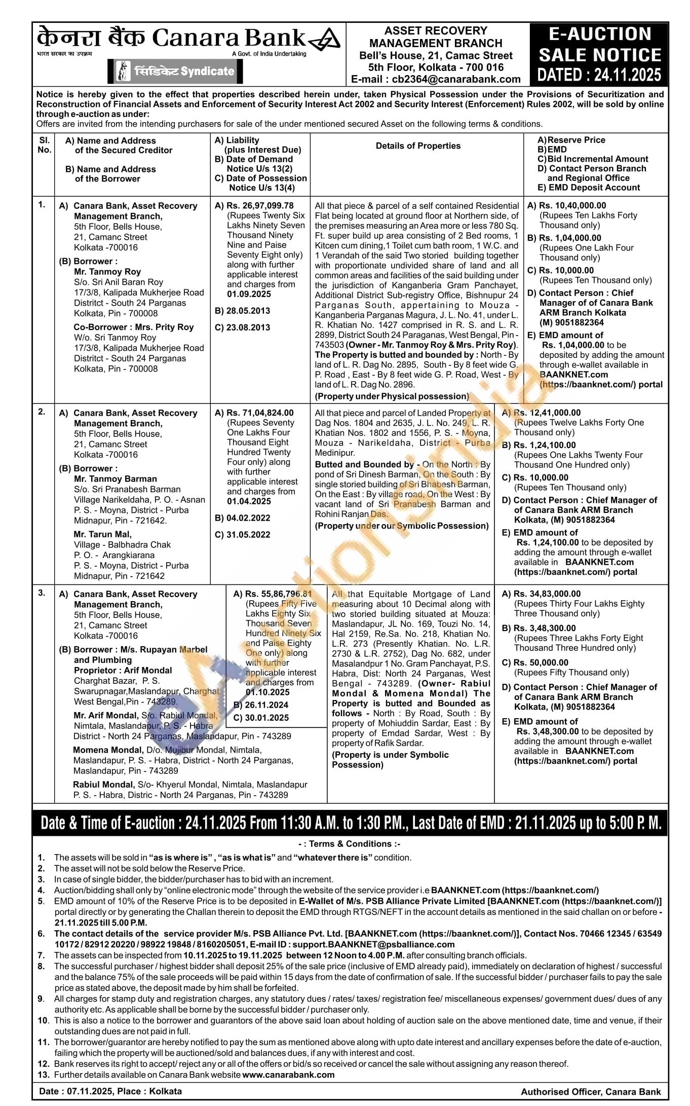 All that piece & parcel of a self contained Residential Flat being located at ground floor at Northern side, of the premises measuring an Area more or less 780 Sq. Ft. super build up area consisting of 2 Bed rooms, 1 Kitcen cum dining, 1 Toilet cum bath room, 1 W.C. and 1 Verandah of the said Two storied building together with proportionate undivided share of land and all common areas and facilities of the said building under the jurisdiction of Kanganberia Gram Panchayet, Additional District Sub-registry Office, Bishnupur 24 Parganas South, appertaining to Mouza Kanganberia Parganas Magura, J. L. No. 41, under L. R. Khatian No. 1427 comprised in R. S. and L. R. 2899, District South 24 Paraganas, West Bengal, Pin 743503 (Owner - Mr. Tanmoy Roy & Mrs. Prity Roy). The Property is butted and bounded by: North - By land of L. R. Dag No. 2895, South - By 8 feet wide G. P. Road, East - By 8 feet wide G. P. Road, West - By land of L. R. Dag No. 2896