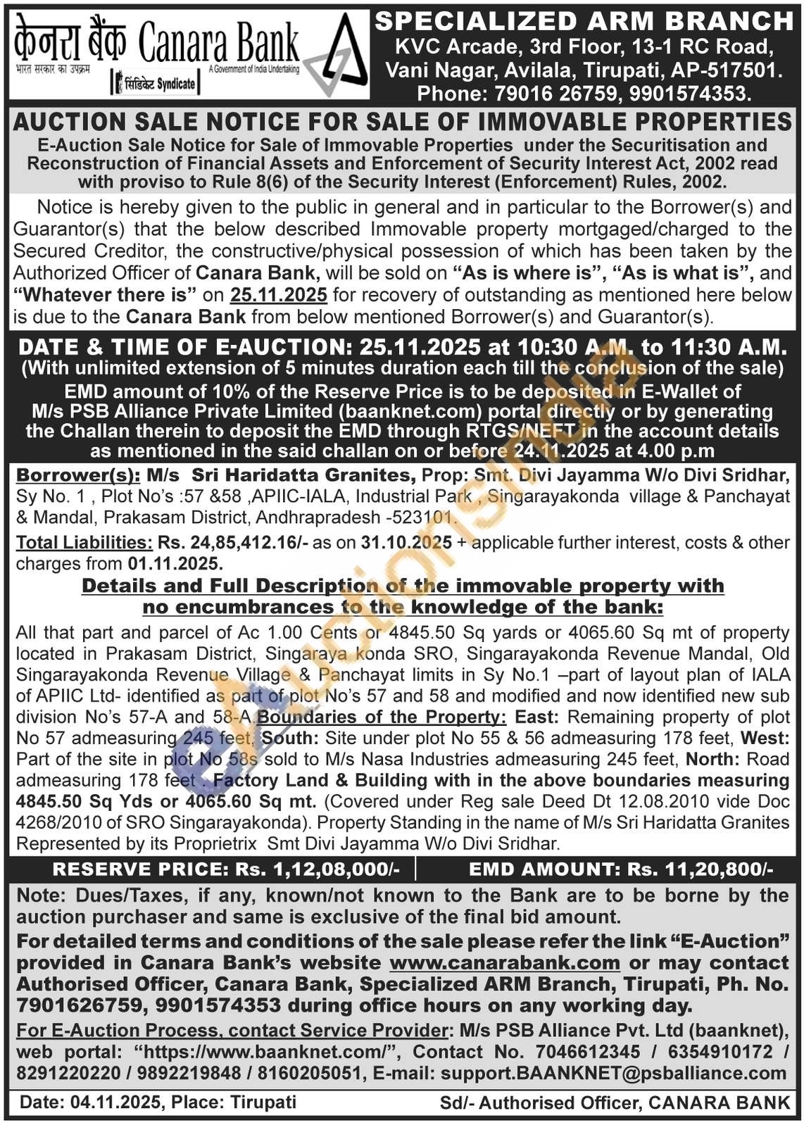 All that part and parcel of Ac 1.00 Cents or 4845.50 Sq yards or 4065.60 Sq mt of property located in Prakasam District, Singaraya konda SRO, Singarayakonda Revenue Mandal, Old Singarayakonda Revenue Village & Panchayat limits in Sy No.1 -part of layout plan of IALA of APIIC Ltd- identified as part of plot No's 57 and 58 and modified and now identified new sub division No's 57-A and 58-A.Boundaries of the Property: East: Remaining property of plot No 57 admeasuring 245 feet, South: Site under plot No 55 & 56 admeasuring 178 feet, West: Part of the site in plot No 58s sold to M/s Nasa Industries admeasuring 245 feet, North: Road admeasuring 178 feet. Factory Land & Building with in the above boundaries measuring 4845.50 Sq Yds or 4065.60 Sq mt. (Covered under Reg sale Deed Dt 12.08.2010 vide Doc 4268/2010 of SRO Singarayakonda). Property Standing in the name of M/s Sri Haridatta Granites Represented by its Proprietrix Smt Divi Jayamma W/o Divi Sridhar.