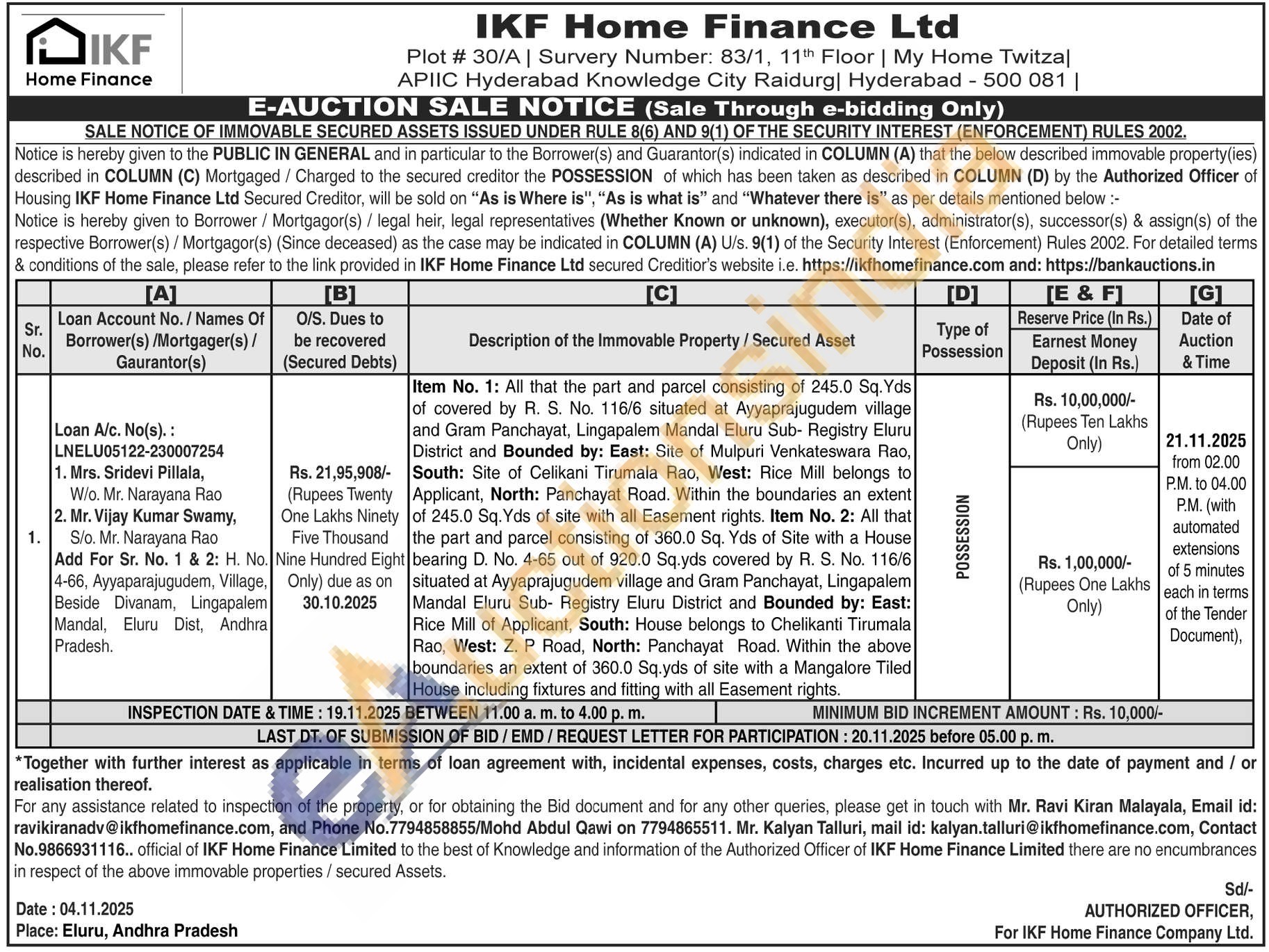 Item No. 1: All that the part and parcel consisting of 245.0 Sq. Yds of covered by R. S. No. 116/6 situated at Ayyaprajugudem village and Gram Panchayat, Lingapalem Mandal Eluru Sub- Registry Eluru District and Bounded by: East: Site of Mulpuri Venkateswara Rao, South: Site of Celikani Tirumala Rao, West: Rice Mill belongs to Applicant, North: Panchayat Road. Within the boundaries an extent of 245.0 Sq. Yds of site with all Easement rights. Item No. 2: All that the part and parcel consisting of 360.0 Sq. Yds of Site with a House bearing D. No. 4-65 out of 920.0 Sq.yds covered by R. S. No. 116/6 situated at Ayyaprajugudem village and Gram Panchayat, Lingapalem Mandal Eluru Sub- Registry Eluru District and Bounded by: East: Rice Mill of Applicant, South: House belongs to Chelikanti Tirumala Rao, West: Z. P Road, North: Panchayat Road. Within the above boundaries an extent of 360.0 Sq.yds of site with a Mangalore Tiled House including fixtures and fitting with all Easement rights.