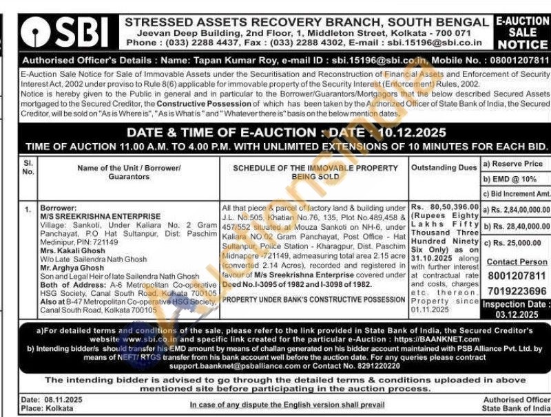 All that piece & parcel of factory land & building under J.L. No.505, Khatian No.76, 135, Plot No.489,458 & 457/552 situated at Mouza Sankoti on NH-6, under Kaliara NO.02 Gram Panchayat, Post Office Hat Sultanpur, Police Station - Kharagpur. Dist. Paschim Midnapore-721149, admeasuring total area 2.15 acre (converted 2.14 Acres), recorded and registered in favour of M/s Sreekrishna Enterprise covered under Deed No.1-3095 of 1982 and 1-3098 of 1982.