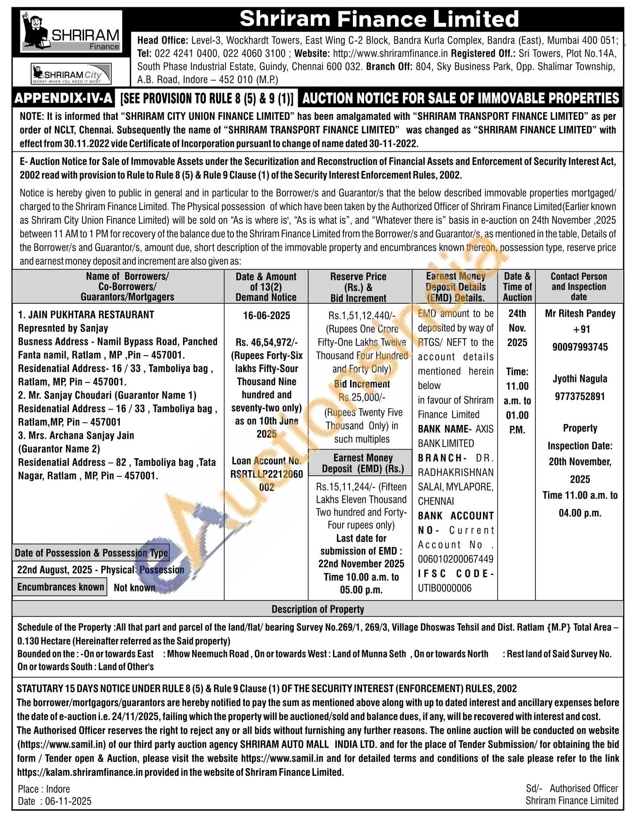 Schedule of the Property: All that part and parcel of the land/flat/ bearing Survey No.269/1, 269/3, Village Dhoswas Tehsil and Dist. Ratlam (M.P} Total Area - 0.130 Hectare (Hereinafter referred as the Said property) Bounded on the:-On or towards East: Mhow Neemuch Road, On or towards West: Land of Munna Seth, On or towards North Rest land of Said Survey No. On or towards South: Land of Other's