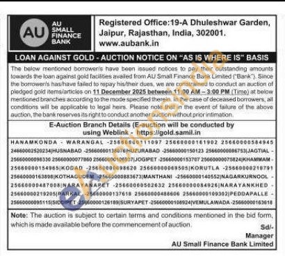 AU Small Finance Bank Gold Auctions Auction in Warangal