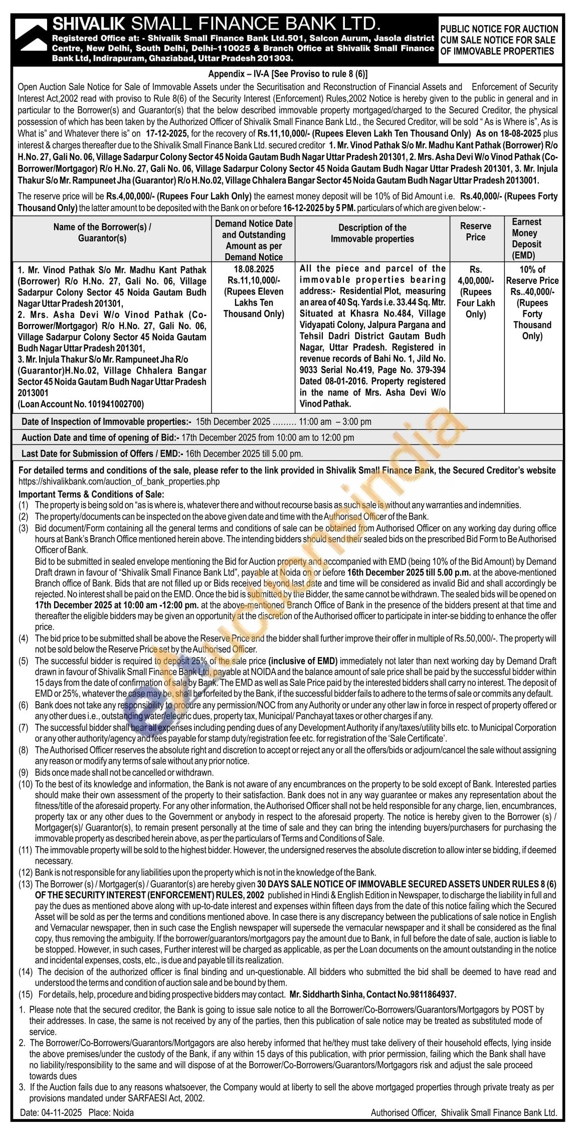 All the piece and parcel of the immovable properties bearing address: Residential Plot, measuring an area of 40 Sq. Yards i.e. 33.44 50. Mtr. Situated at Khasra No.484, Village Vidyapati Colony, Jalpura Pargana and Tehsil Dadri District Gautam Budh Nagar, Uttar Pradesh. Registered in revenue records of Bahi No. 1, Jild No. 9033 Serial No 419, Page No. 379-394 Dated 08-01-2016. Property registered in the name of Mrs. Asha Devi Wio Vinod Pathak