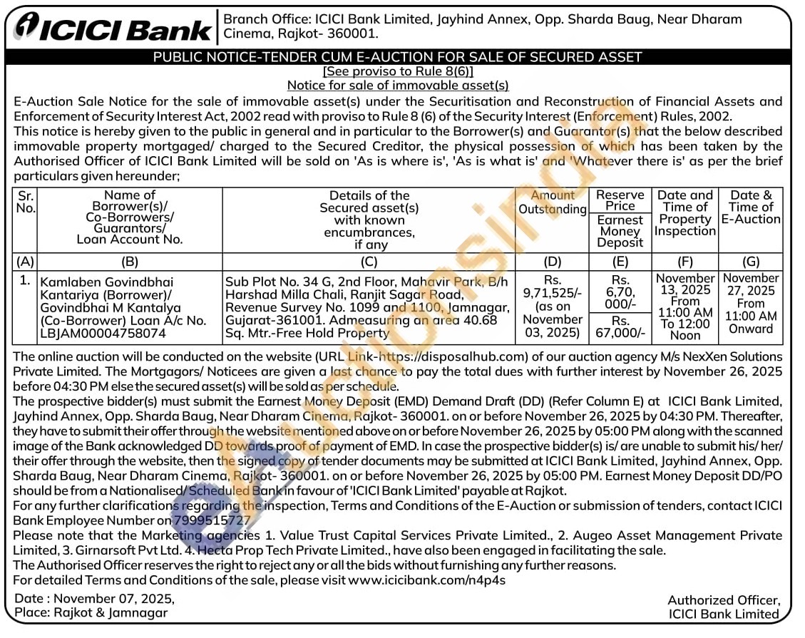 Sub Plot No. 34 G, 2nd Floor, Mahavir Park, B/h Harshad Milla Chali, Ranjit Sagar Road, Revenue Survey No. 1099 and 1100, Jamnagar, Gujarat-361001. Admeasuring an area 40.68 Sq. Mtr.-Free Hold Property
