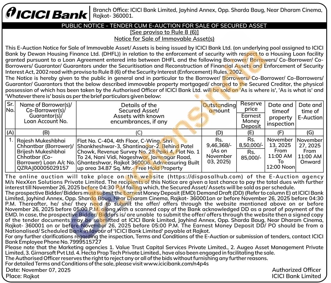 Flat No. C-404, 4th Floor, C-Wing, Shri Shankheshwar-3, Shantinagar-2, Behind Patel Chowk, Revenue Survey No. 28 Paiki 4, Plot No. 1 To 24, Nani Vidi, Nageshwar, Jamnagar Road, Ghanteshwar, Rajkot 360006. Admeasuring Built up area 34.87 Sq. Mtr.- Free Hold Property