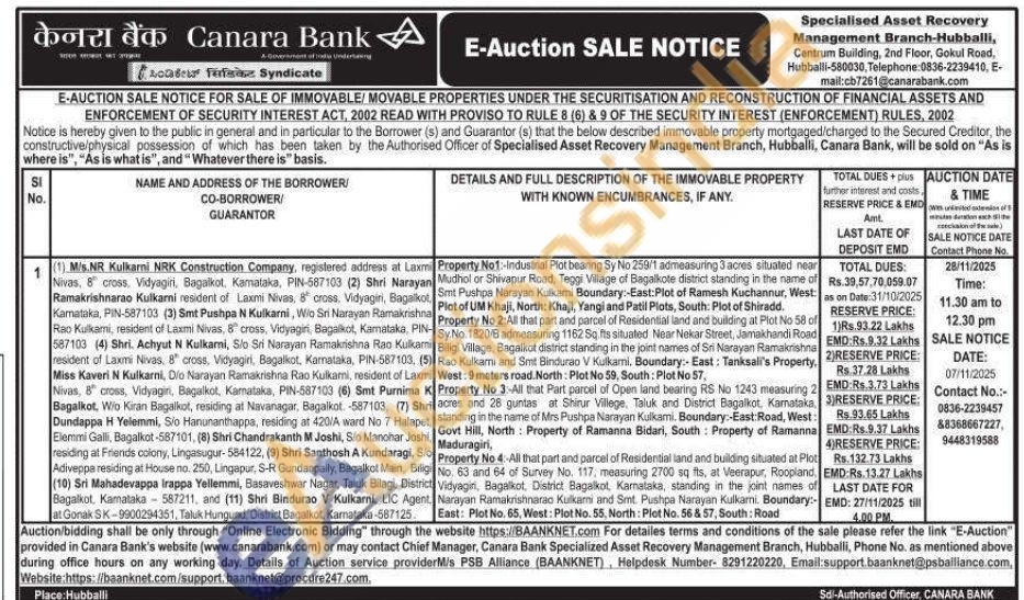 Property No 3-All that Part parcel of Open land bearing RS No 1243 measuring 2 acres and 28 guntas at Shirur Villege. Taluk and District Bagalkot, Karnataka, standing in the name of Mrs Pushpa Narayan Kulkami. Boundary:-East:Road, West: Govt Hill, North: Property of Ramanna Bidari, South Property of Ramanna