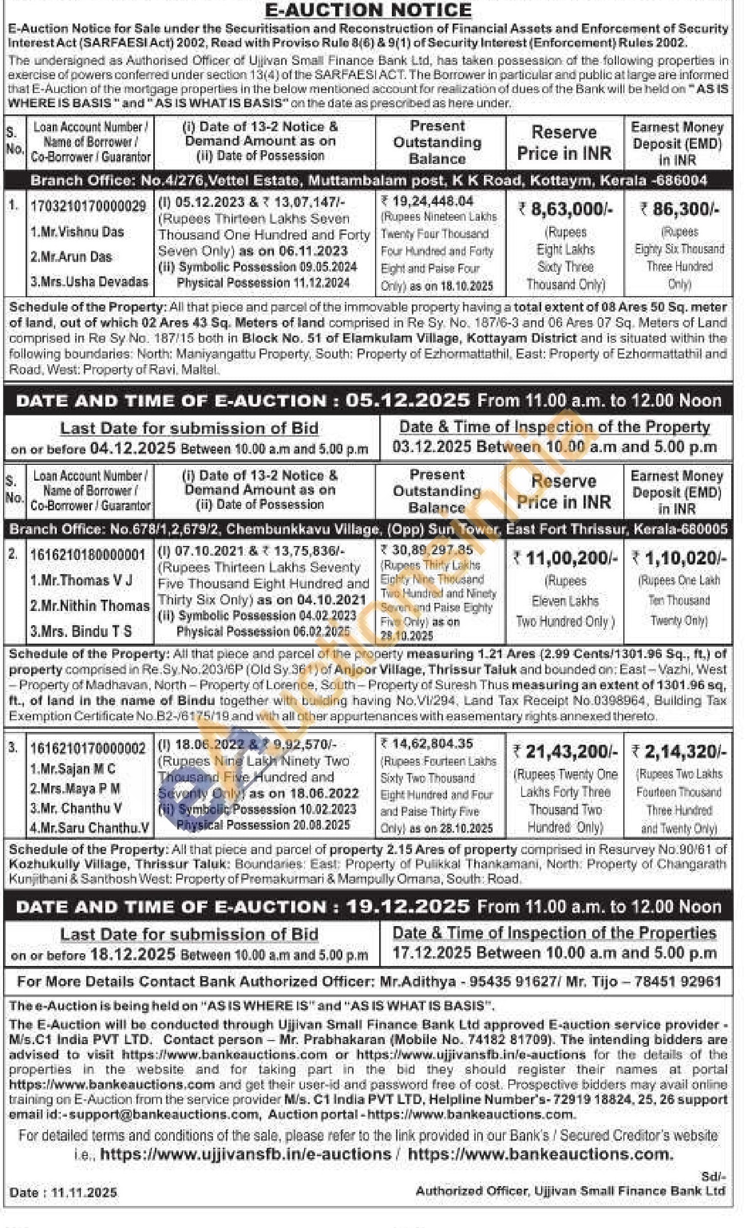 Schedule of the Property: All that piece and parcel of property 2.15 Ares of property comprised in Resurvey No.90/61 of Kozhukully Village, Thrissur Taluk: Boundaries East: Property of Pulikkal Thankamani, North: Property of Changarath Kunjithani & Santhosh West: Property of Premakurmari & Mampully Ormana, South: Road.