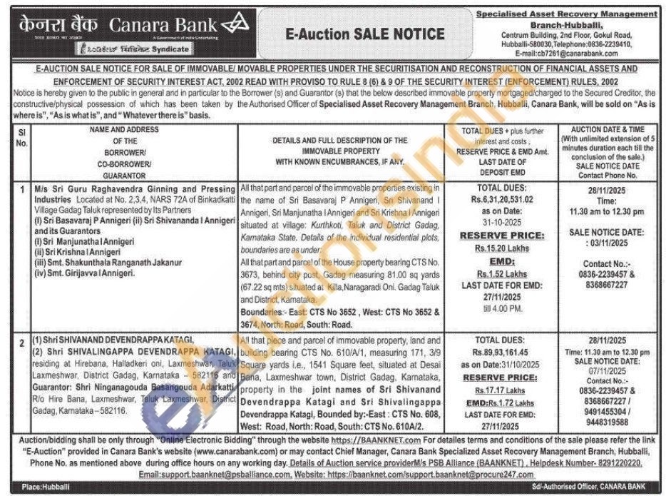 All that piece and parcel of immovable property, land and building bearing CTS No. 610/A/1, measuring 171, 3/9 Square yards i.e., 1541 Square feet, situated at Desai Bana, Laxmeshwar town, District Gadag, Karnataka, property in the joint names of Sri Shivanand Devendrappa Katagi and Sri Shivalingappa Devendrappa Katagi, Bounded by:-East: CTS No. 608, West: Road, North: Road, South: CTS No. 610A/2.