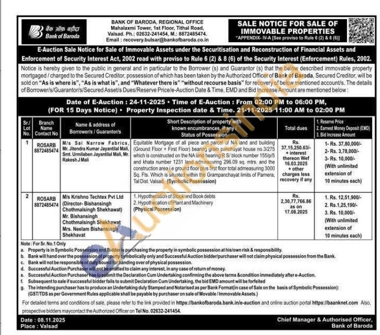 Equitable Mortgage of all piece and parcel of NA land and building (Ground Floor + First Floor) bearing gram panchayat house no.3/275 which is constructed on the NA land bearing R S/block number 155/p/5 and khata number 1231 land admeasuring 296.09 sq. mtrs, and the construction area ile ground floor plus first floor total admeasuring 3000 Sq. Fts. Which is situated within the Grampanchayat limits of Pamera, Tal Dist. Valsad. (Symbolic Possession)