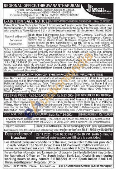 Item No.2: All that piece and parcel of land admeasuring 6.00 Ares out of 12.86 Ares together with all other improvements therein in Sy No. 141/5, Re. Sy No 139/9, Block No. 5 in Pallichal Village, Neyyantinkara Taluk, Thiruvananthapuram District owned by Mano E B and morefully. described in the Sale Deed No. 3616/1978 dated 21-12-1978 of Balaramapuram SRO and BOUNDED North Road, South Property of Saraswathy East Own Property, West Road