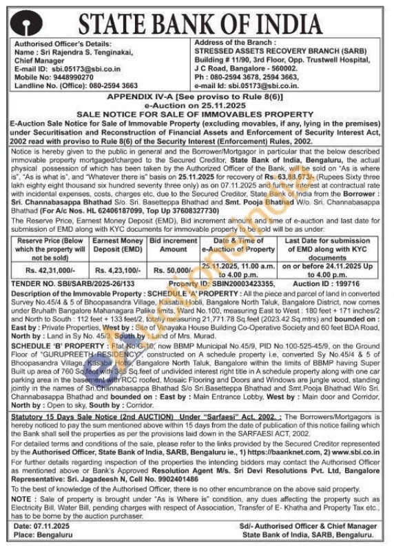 SCHEDULE 'A' PROPERTY: All the piece and parcel of land in converted Survey No.45/4 & 5 of Bhoopasandra Village, Kasaba Hobli, Bangalore North Taluk, Bangalore District, now comes under Bruhath Bangalore Mahanagara Palike limits, Ward No. 100, measuring East to West: 180 feet + 171 inches/2 and North to South 112 feet 133 feet/2, totally measuring 21,771.78 Sq. feet (2023.42 Sq.mtrs) and bounded on: East by: Private Properties, West by: Site of Vinayaka House Building Co-Operative Society and 60 feet BDA Road. North by: Land in Sy No. 45/3, South by: Land of Mrs. Murad. SCHEDULE 'B' PROPERTY: Flat No. G-10, now BBMP Municipal No. 45/9, PID No 100-525-45/9, on the Ground Floor of "GURUPREETH RESIDENCY", constructed on A schedule property le, converted Sy No. 45/4 & 5 of Bhoopasandra Village, Kasaba Hobli, Bangalore North Taluk, Bangalore within the limits of BBMP having Super Built up area of 760 Sq feet with 385 Sq.feet of undivided interest right title in A schedule property along with one car parking area in the basement with RCC roofed, Mosaic Flooring and Doors and Windows are jungle wood, standing jointly in the names of Sri Channabasappa Bhathad Sio Sri Basetteppa Bhathad and Smt. Pooja Bhathad Wio Sri. Channabasappa Bhathed and bounded on: East by: Main Entrance Lobby, West by: Main door and Corridor, North by: Open to sky, South by: Corridor.