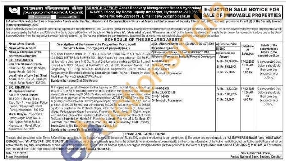 All that part and parcel of Residential Flat bearing no: 203, in First Floor, with built up area of 970.00 Sq Ft (including common area) together with proportionate undivided share of sile admeasuring 24.56 Sq. Yd along with one car parking area earmarked in the stilt floor on the premises of the mansion renamed as "LOTUS TOWERS" in plot no 27 & 32 (contiguous to each other, forming single compact block, each size-5072) and to an extent of 400.00 Sq. Yds, total admeasuring 800.00 Sq Yds, or equivalent to 668.88 Sq Meters situated at Sai Prabhath Nagar, within the revenue limits of Edulapuram Village, Peddathanda Gram Panchayat, Khammam Rural Mandal & District, under territorial Jurisdiction of the registration District of Khammam and Sub District of Rural The Land is bounded by: North: 33-Ft wide road, South: Plot Nos 26 & 33, East: 30 Feet Wide Road, West: 30' Feet Wide Road, The Flat is bounded by: North: Corridor, South: Open to Sky, East: Open to Sky, West: Open to Sky Stands in the name of Mr. Bayaneni Sridhar