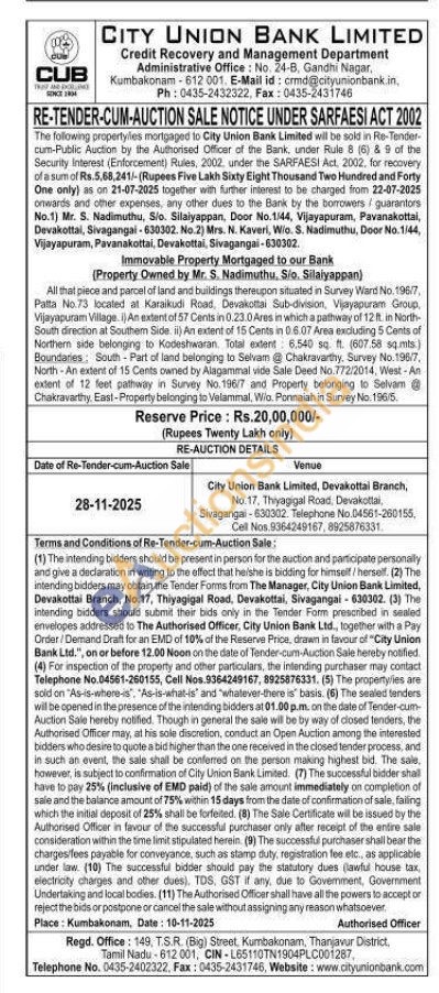 All that piece and parcel of land and buildings thereupon situated in Survey Ward No. 196/7, Palta No.73 located at Karaikudi Road, Devakottai Sub-division, Vijayapuram Group, Vijayapuram Village. i) An extent of 57 Cents in 0.23.0 Ares in which a pathway of 12 ft in North-South direction at Southem Side ii) An extent of 15 Cents in 0.6.07 Area excluding 5 Cents of Northern side belonging to Kodeshwaran. Total extent 6,540 sq. ft. (607.58 sq.mts) Boundaries: South - Part of land belonging to Selvam @ Chakravarthy, Survey No. 196/7, North-An extent of 15 Cents owned by Alagammal vide Sale Deed No. 772/2014, West-An extent of 12 feet pathway in Survey No.196/7 and Property belonging to Selvam Chakravarthy, East-Property belonging to Velammal, Wio. Ponnaiah in Survey No. 196/5.