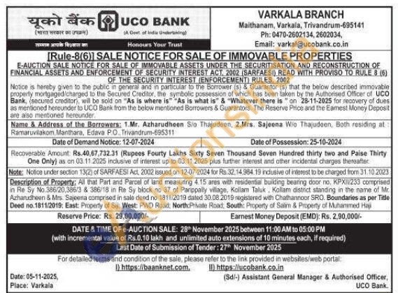 Description of Property: All that Part and Parcel of land measuring 4.15 ares with residential building bearing door no. KPX/233 comprised in Re Sy No.386/20,386/3 & 386/18 in Re Sy block no 37 of Parippally village, Kollam Taluk, Kollam district standing in the name of Mr. Azharudheen & Mrs. Sajeena comprised in sale deed no 1811/2019 dated 30.08.2019 registered with Chethannoor SRO. Boundaries as per Title Deed no.1011/2019: East: Property of Sij, West: PWD Road, North: Private Road, South: Property of Salim & Property of Muhanmed Haji