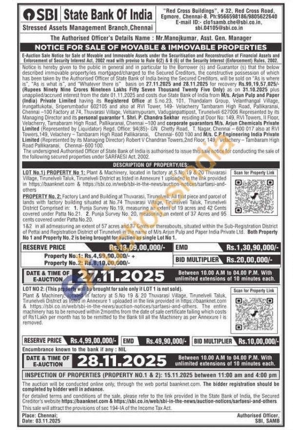 LOT No.2 Plant & Machinery, located in factory at S.No 19 & 20 Thuvarasi Village, Tirunelveli Taluk, Tirunelveli District as listed in Annexure 1 uploaded in the link provided in fittps://baanknet.com & https://sbl.co.in/web/sbi-in-the-news/auction-notices/sarfaesi-and-others. The entire machinery has to be removed within 2months from the date of sale certificate failing which costs of Rs1Lakh per month has to be remitted to the Bank till all the Machinery as per Annexure 1 is removed.