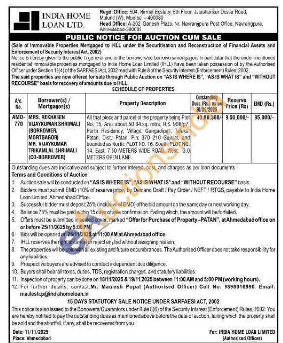 All that piece and parcel of the property being Plot No. 15, Area about 50.64 sq. mtrs. R.S. 908/p7. Parth Residency, Village: Gungadipati, Taluka: Patan, Dist. Patan, Pin: 370 210 Gujarat, and bounded as North: PLOT NO. 16, South: PLOT NO. 14, East: 7.50 METERS WIDE ROAD, West: 3.0 METERS OPEN LANE