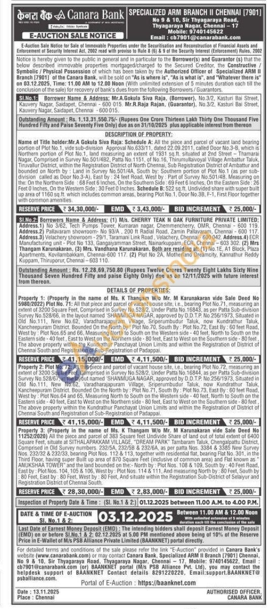 2) Property 2: Plot No. 72: All that piece and parcel of vacant house site, i.e., bearing Plot No 72, measuring an extent of 3200 Square Feet, Comprised in Survey No.528/2, Under Patta No. 16844, as per Patta Sub-division Survey No.528/67, in the layout named SHANMUGA NAGAR, approved by D.D.T.P. No.256/1973, Situated in Old No.111, New No.62, Varadharajapuram Village, Sriperumbudur Taluk, now Kundrathur Taluk, Kancheepuram District. Bounded On the North by: Plot No. 71, South By: Plot No.73, East By: 60 feet Road, West by: Plot Nos.64 and 65, Measuring North to South on the Western side-40 feet, North to South on the Eastern side-40 feet, East to West on the Northern side-80 feet, East to West on the Southern side-80 feet. The above property within the Kundrathur Panchayat Union Limits and within the Registration of District of Chennai South and Registration of Sub-Registration of Padappai