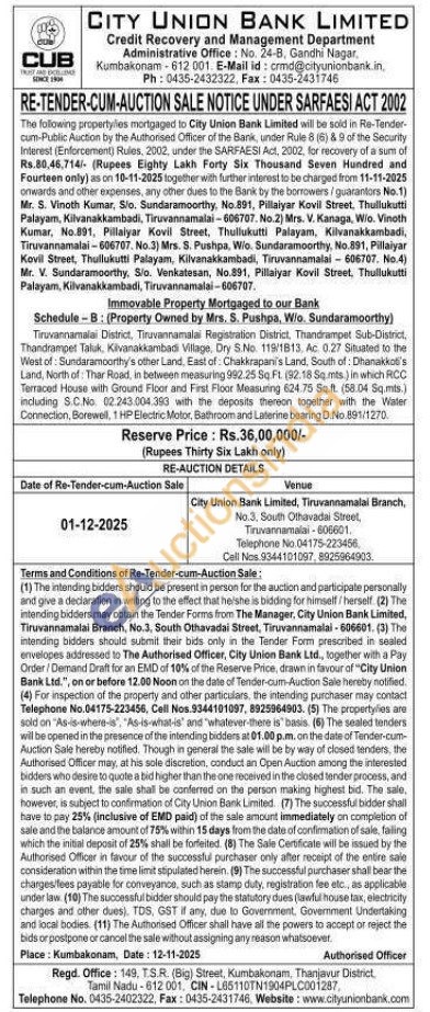 Tiruvannamalai District, Tiruvannamalai Registration District, Thandramput Sub-District, Thandrampet Taluk, Kivanakkambadi Village, Dry S.No. 119/1813. Ac 0.27 Situated to the West of: Sundaramoorthy's other Land, East of: Chakkrapani's Land, South of: Dhanakkot's Land, North of: Thar Road, in between measuring 992.25 Sq.Ft. (92.18 Sq.mts.) in which RICC Terraced House with Ground Floor and First Floor Measuring 624.75 Sq.ft. (58.04 Sq.mts.) including S.C.No. 02.243.004.393 with the deposits thereon together with the Water Connection, Borewell, 1 HP Electric Motor, Bathroom and Laterine bearing D.No.891/1270