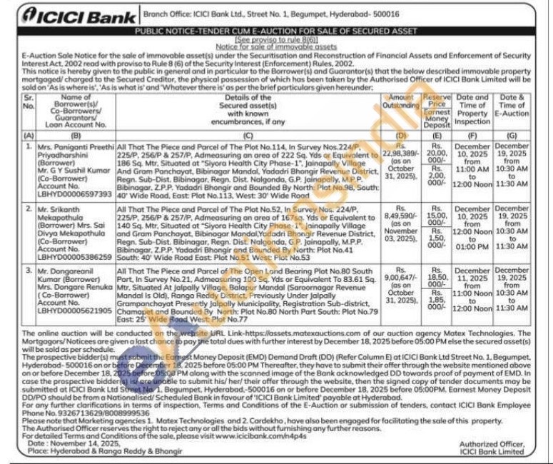 1)All That The Piece and Parcel of The Plot No.114, In Survey Nos. 224/P, 225/P, 256/P & 257/P, Admeasuring an area of 222 Sq. Yds or Equivalent to 186 Sq. Mtr, Situated at "Siyora Health City Phase-1", Jainapally Village And Gram Panchayat, Bibinagar Mandal, Yadadri Bhangir Revenue District, Regn. Sub-Dist. Bibinagar, Regn. Dist. Nalgonda, G.P. Jainapally, M.P.P. Bibinagar. Z.P.P. Yadadri Bhongir and Bounded By North: Plot No.98, South: 40° Wide Road, East: Plot No.113. West: 30' Wide Road