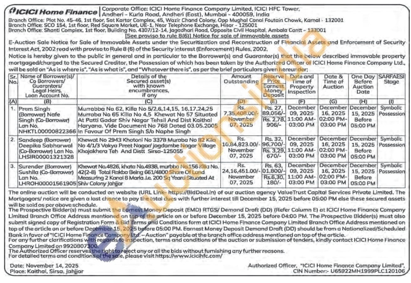 1)Murrabba No. 62, Killa No 5/2,6,14,15, 16,17,24,25 Murraba No 65 Killa No 4,5 Khewat No 57 Situated At Patti Gadar Shiv Nagar Tehsil And Dist Kaithal Haryana. Vide Document No 768 Dated 03.05.2005 In Favour Of Prem Singh S/o Naphe Singh