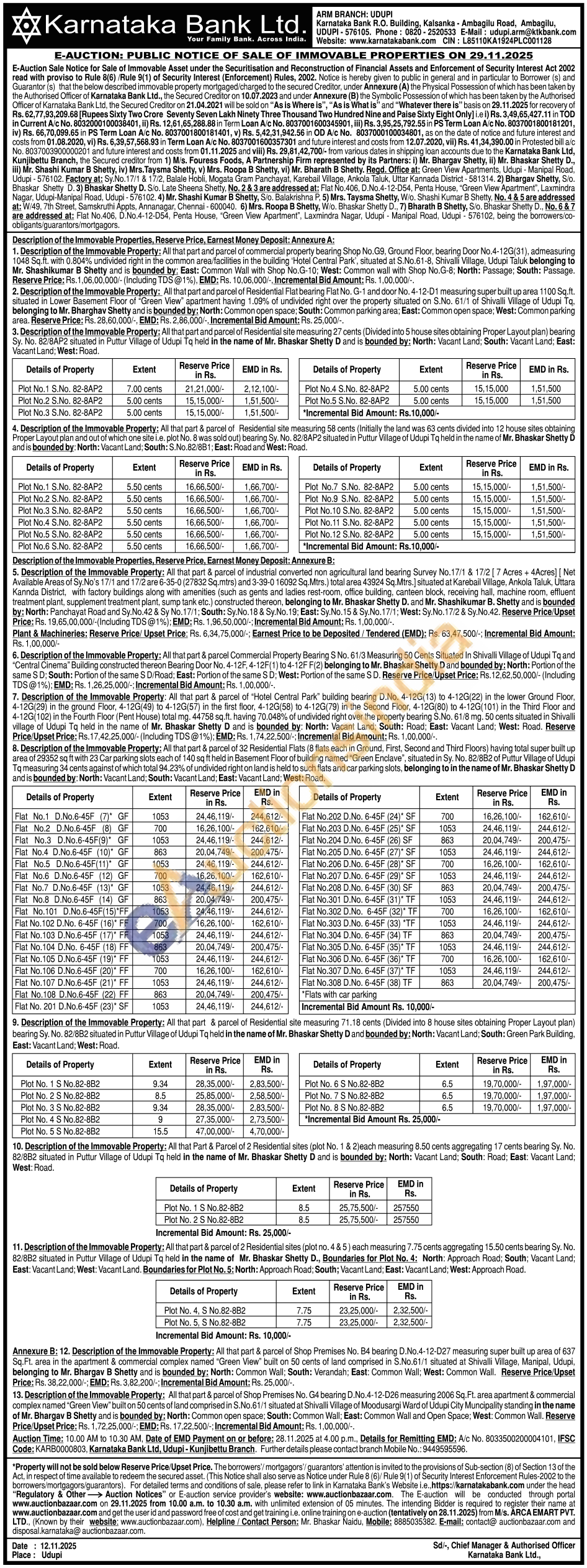 All that Part & Parcel of 2 Residential sites (plot No. 1 & 2) each measuring 8.50 cents aggregating 17 cents bearing Sy. No. 82/8B2 situated in Puttur Village of Udupi Tq held in the name of Mr. Bhaskar Shetty D and is bounded by: North: Vacant Land; South: Road; East: Vacant Land; West: Road.