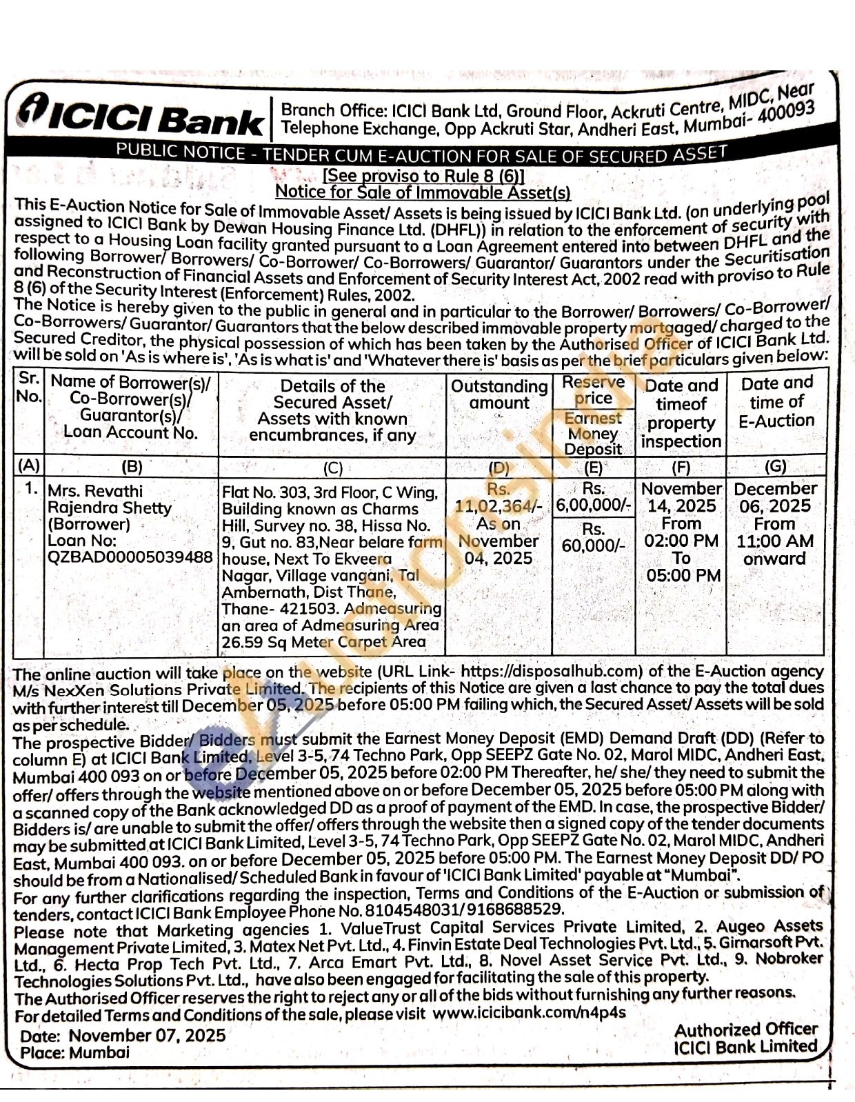 Flat No. 303, 3rd Floor, C Wing. Building known as Charms Hill, Survey no. 38, Hissa No. 9, Gut no. 83, Near belare farm house, Next To Ekveera Nagar, Village vangani, Tal Ambernath, Dist Thane, Thane-421503. Admeasuring an area of Admeasuring Area 26.59 Sq Meter Carpet Area