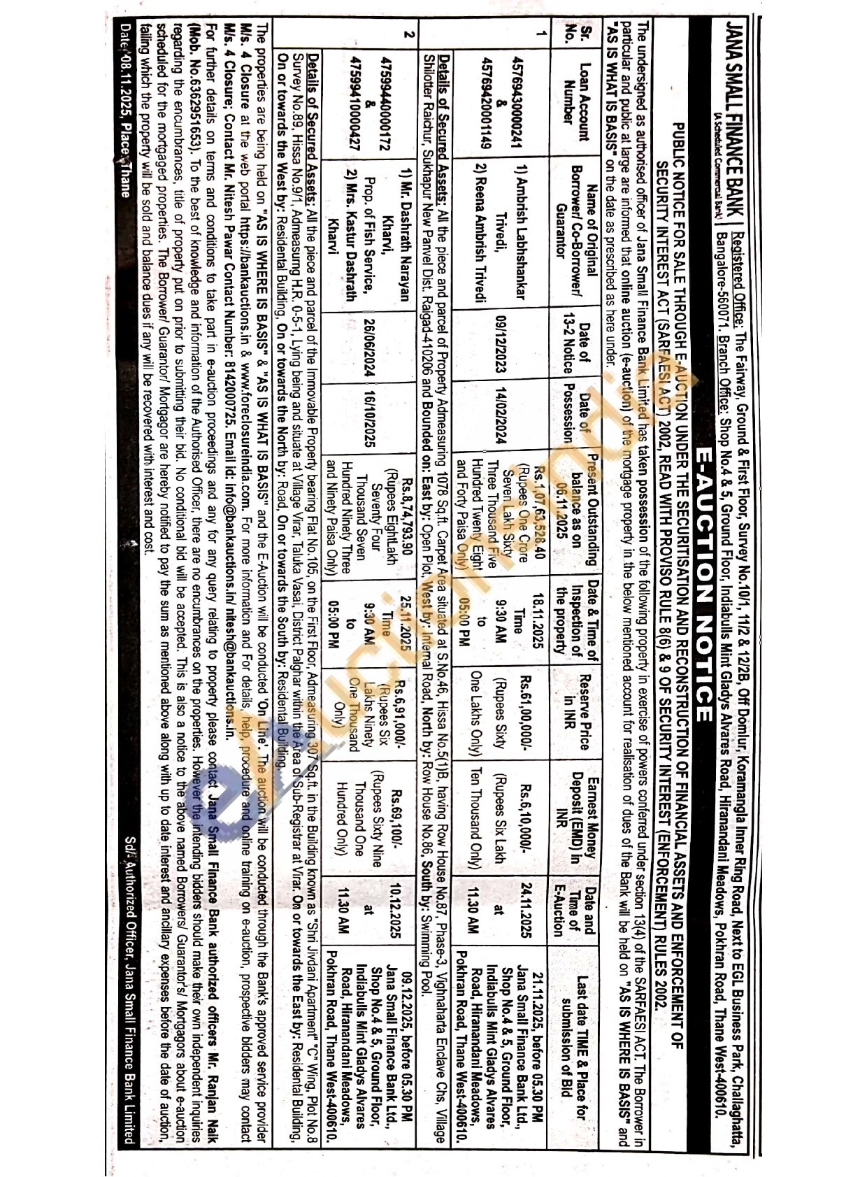Details of Secured Assets; All the piece and parcel of the Immovable Property bearing Flat No. 105, on the First Floor, Admeasuring 307 Sq.ft. in the Building known as "Shri Jivdani Apartment" "C" Wing, Plot No.8 Survey No.89, Hissa No.9/1, Admeasurng H.R. 0-5-1, Lying being and situate at Village Virar, Taluka Vasai, District Palghar within the Area of Sub-Registrar at Virar. On or towards the East by: Residental Building, On or towards the West by: Residental Building, On or towards the North by: Road, On or towards the South by: Residental Building.