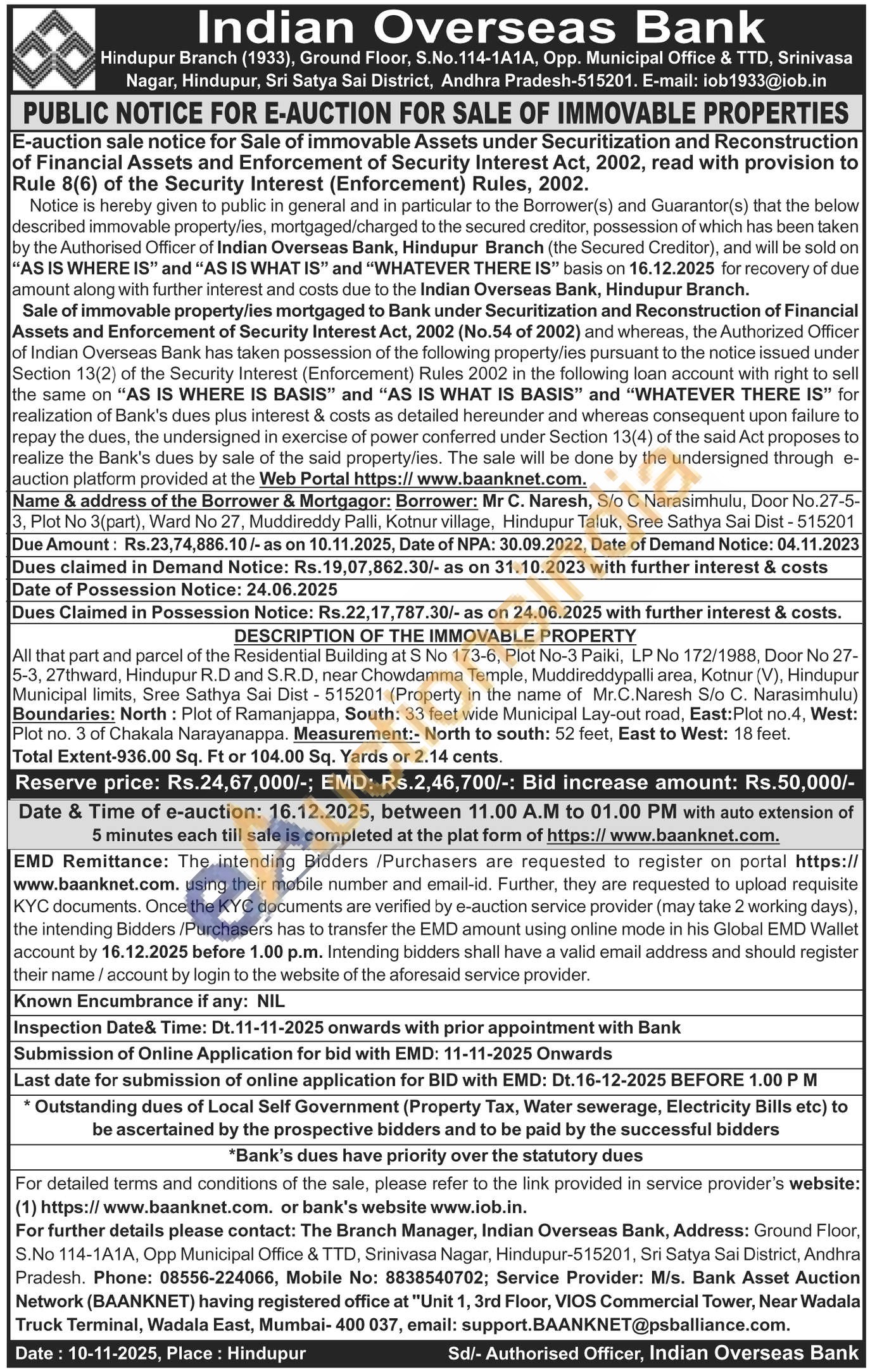 All that part and parcel of the Residential Building at S No 173-6, Plot No-3 Paiki, LP No 172/1988, Door No 27-5-3, 27thward, Hindupur R.D and S.R.D, near Chowdamma Temple, Muddireddypalli area, Kotnur (V), Hindupur Municipal limits, Sree Sathya Sai Dist-515201 (Property in the name of Mr.C.Naresh S/o C. Narasimhulu) Boundaries: North: Plot of Ramanjappa, South: 33 feet wide Municipal Lay-out road, East:Plot no.4, West: Plot no. 3 of Chakala Narayanappa. Measurement:- North to south: 52 feet, East to West: 18 feet. Total Extent-936.00 Sq. Ft or 104.00 Sq. Yards or 2.14 cents.
