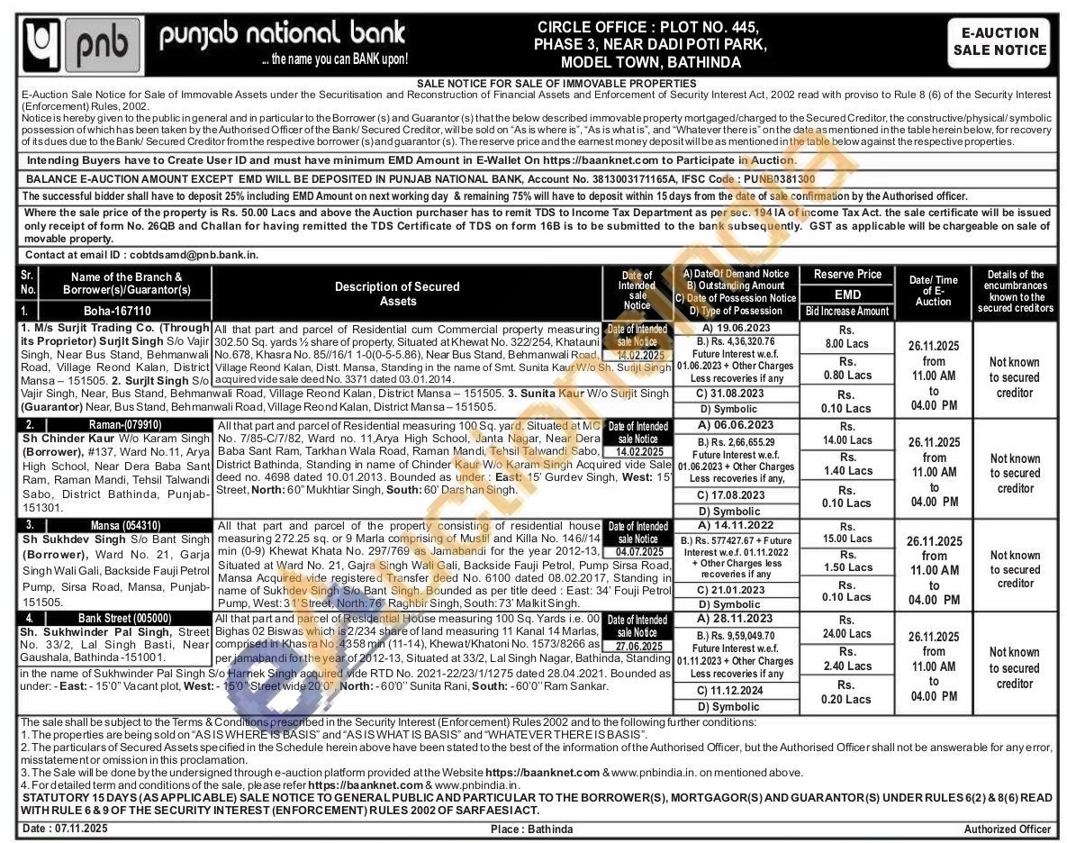 All that part and parcel of Residential cum Commercial property measuring Surjit Singh S/o Vajir 302.50 Sq. yards ½ share of property, Situated at Khewat No. 322/254, Khatauni Stand, Behmanwali No.678, Khasra No. 85//16/1 1-0(0-5-5.86), Near Bus Stand, Behmanwali Road, Reond Kalan, District Village Reond Kalan, Distt. Mansa, Standing in the name of Smt. Sunita Kaur W/o Sh. Surijt Singh 0 2. Surjit Singh S/o acquired vide sale deed No. 3371 dated 03.01.2014.
